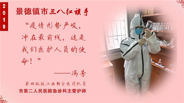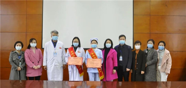 我院援助湖北、新余医疗队员高梅梅、詹勇慧、程柚圆、范琦茜、冯芳五名同志在新冠肺炎防控阻击战中,守护着人民群众的健康,成为新时代巾帼英雄,被市妇联授予“市三八红旗手”荣誉。同时,护理部负责人汪迎春、感控科科长余虹两位同志在疫情防控工作中表现突出,被市妇联分别授予“市巾帼建功标兵”、“市三八红旗手”荣誉称号。