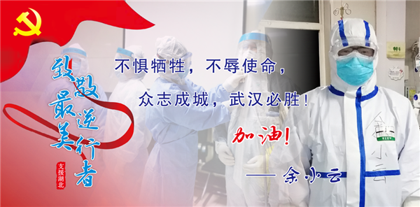 “在援助湖北队伍里,总是党员冲在前面,坚定的信仰,磅礴的力量使党旗在抗疫一线熠熠生辉。为此我渴望成为一名共产党员,在这场没有硝烟的战场上,冲锋在前、敢当尖兵,直至战斗胜利......”战斗间隙,余小云向党组织递交了入党申请书。“期待早日投入党的怀抱,成为光荣的一员,让这身白衣胜雪再添上党徽的闪耀!”他充满向往地说到。