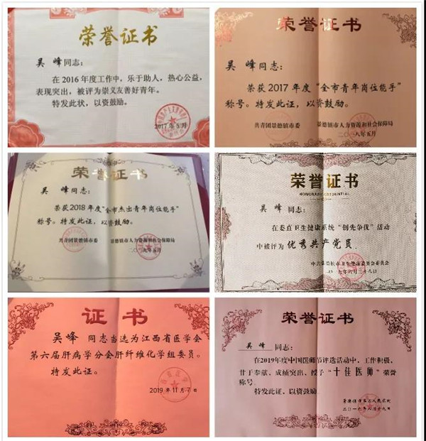 作为景德镇市市级医疗卫生应急队骨干,吴峰累计救治危重患者700余人次,无一例医疗纠纷或投诉,2017年成功救治服用后死亡率100%的剧毒农药百草枯患者的事例更被多家网站争相报道。熟练掌握各类内镜技术,累计完成内镜操作1700余人次,带头开展消化道出血的内镜下治疗新技术,独立完成本单位第1例内镜下肝硬化食管静脉曲张破裂出血急诊套扎止血治疗术等,极大的提升了消化道出血患者的急救成功率。主持市级课题1项,合作开展省级课题1项,参与市级课题1项,发表了国家、省级论文5篇。做好常规医疗工作之余,积极组织参加义诊、保障等志愿活动,提供各类服务720余人次,2016年帮助困难老人就医的事迹,被中国江西网、微观景德镇等多家网络媒体刊登报道。