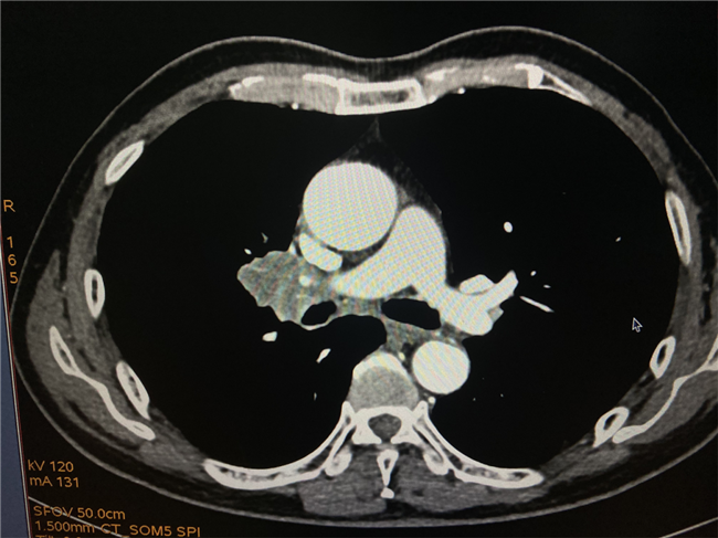 该名78岁的男性患者于2019年3月确诊为鳞状细胞肺癌,经支气管动脉灌注化疗曾一度病情缓解,但近期复查胸部CT示肿瘤病灶较前增大,考虑患者患者年龄较大,化疗效果不佳,常规放射治疗又难以耐受,为防止肿瘤进一步转移恶化,经与上级医院联合会诊后,呼吸内科团队决定对患者实施碘125放射性粒子植入治疗。