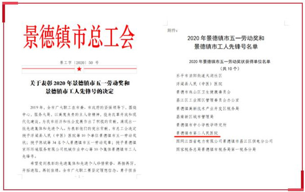 近日,景德镇市总工会决定表彰2020年景德镇市五一劳动奖状和景德镇市工人先锋号。市二医院喜获市五一劳动奖状荣誉称号。此前,10名驰援湖北、新余的医护人员,荣获市五一劳动奖章称号。