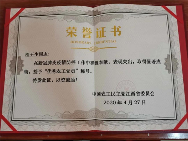 近日,农工党江西省委印发《关于表彰新冠肺炎疫情防控工作“优秀农工党员”的决定》,对在疫情期间表现突出的先进典型予以表彰。市二医院心血管内科副主任程王生荣获全省新冠肺炎疫情防控工作“优秀农工党员”称号。