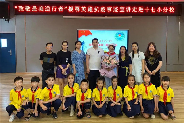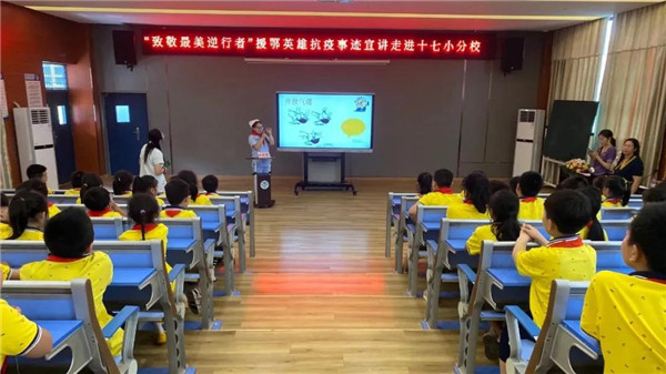 6月9日,江西省第一批支援湖北医疗队队员、市二医院重症医学科的护士长詹勇慧走进市第十七小学分校开讲。少先队员向詹勇慧送上鲜花表达最崇高的敬意。分享了日常抗疫工作中的点点滴滴。她介绍说,通过与队友54天的并肩作战,经过团队对患者的科学救治与辛勤付出,我们取得了抗疫的阶段性胜利。我们以党员使命时刻严格要求自己,持之以恒,用艰苦奋斗、顽强拼搏的精神来展现江西这片红土地上成长起来的英雄儿女的英雄本色,大家不辱使命,完美的书写了抗疫胜利的篇章,并向祖国交上了一份满意的答卷!战“疫”故事分享完,詹勇慧还现场教授心肺复苏和人工呼吸的方法。