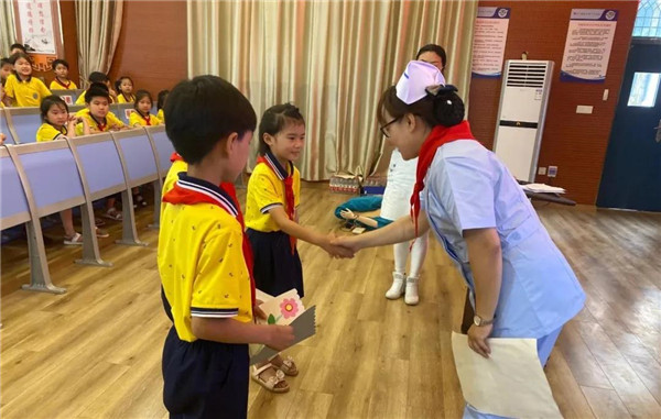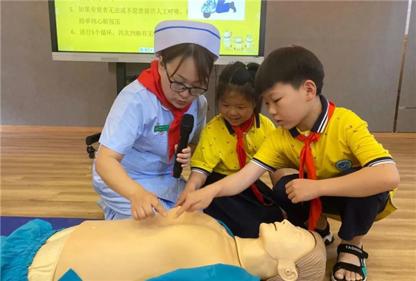 心肺复苏环节后,二至四年级学生代表感慨道:詹护士长,不畏艰险、全力投入这场抗疫行动,舍小家、为大家,这种勇于奉献、舍己为人的精神,体现了民族信仰、国家力量和个人担当,更可贵的是她视自己为一位普通的母亲,将朴实谦和的英雄品格展现得淋漓尽致。