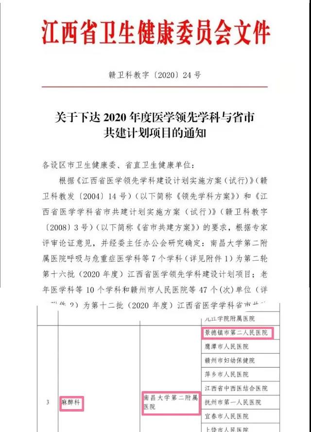 近日,市二医院麻醉科获批江西省医学学科省市共建计划项目,这是麻醉科继成为景德镇医学会麻醉专业委员会和景德镇市麻醉质量控制中心挂靠单位之后,麻醉科取得的又一成绩。