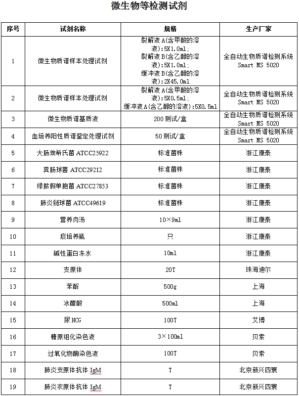 郑重声明:我院不对附件中需求产品的品牌、生产厂家、产品型号作任何限定,表中材料名称、规格型号等有关信息仅作参考,配送商经实地勘察、咨询核实后,根据实际用途提供需求产品对应类似规格型号的医用试剂及配套设备。