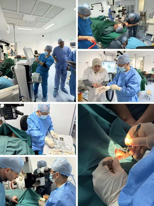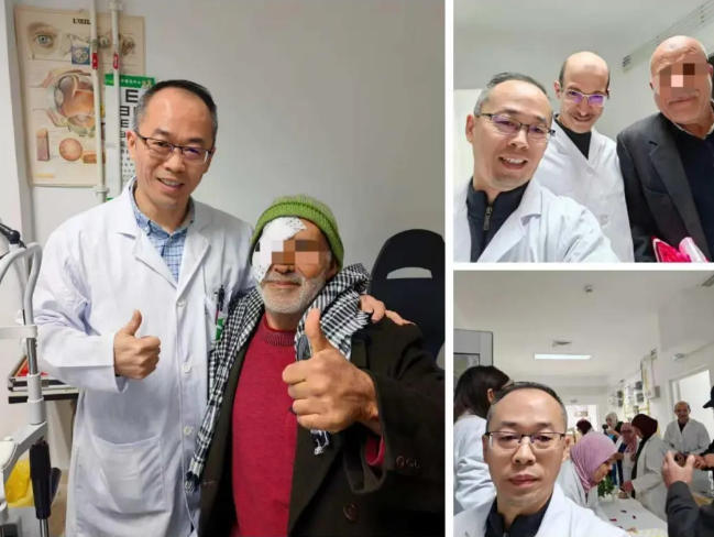刀尖在眼球上精准游走,超声乳化头轻柔震荡,混浊的晶状体被击碎、吸出。仅仅10余分钟,切口不足 3 毫米。当纱布揭开的那一刻,老人枯涩的眼睛突然亮了:“我能看见了!” 术后第二天,他的视力从眼前手动恢复到 0.6。得知老人家境贫寒,王子传悄悄协调医疗队资源,为他送去全程所需的眼药水,还蹲在病床前,用刚学会的几句阿拉伯语,一遍遍示范滴药的姿势。